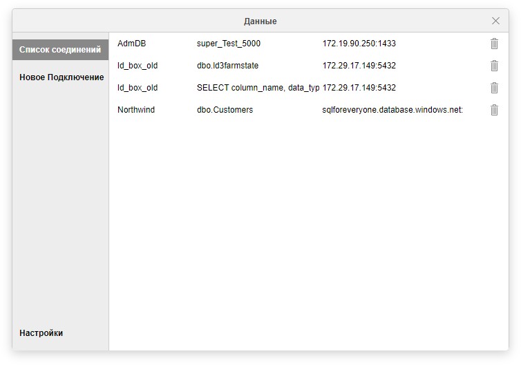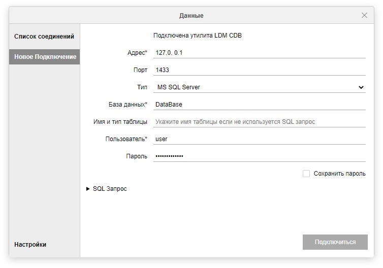 При необходимости получения выборочных данных из базы при подключении можно сразу задать структурированный запрос (на SQL или его аналоге, поддерживаемом базой данных). Этот запрос так же будет сохранен в списке соединений (установлены соответствующие драйвера или библиотеки).