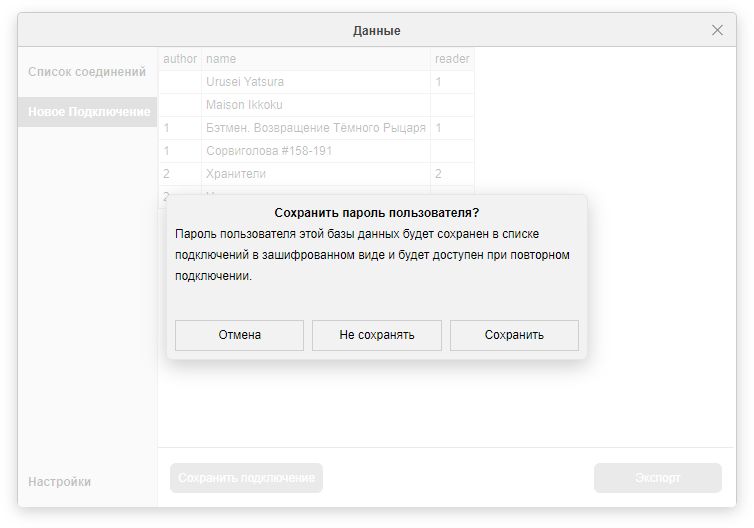 Список соединений хранит в себе данные для повторного соединения с базой данных. Пароль доступа к базе будет сохранен только по желанию пользователя и в зашифрованном виде с использованием ключа PBKDF2 с SHA-256 сгенерированного относительно ПК пользователя и алгоритмом блочного шифрования AES-GCM.