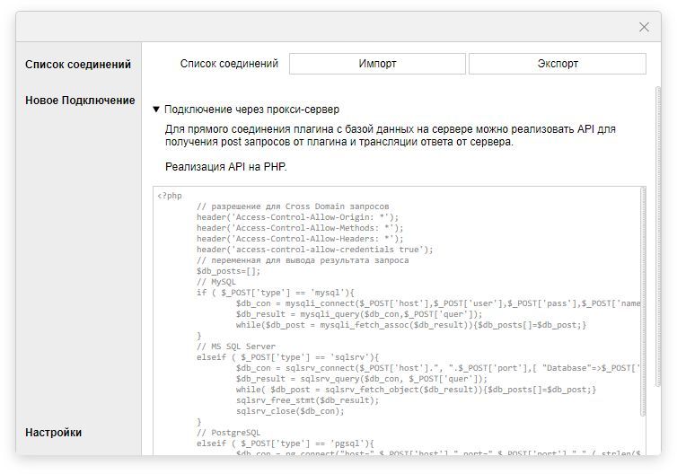 Дополнительно можно указать адрес прокси сервера с настроенным API для подключения к базе данных, пример кода такого API на PHP можно найти в разделе настройка плагина (утилите API не требуется). При его наличии в форме для подключения к базе появится новый пункт “Использовать прокси-сервер”.